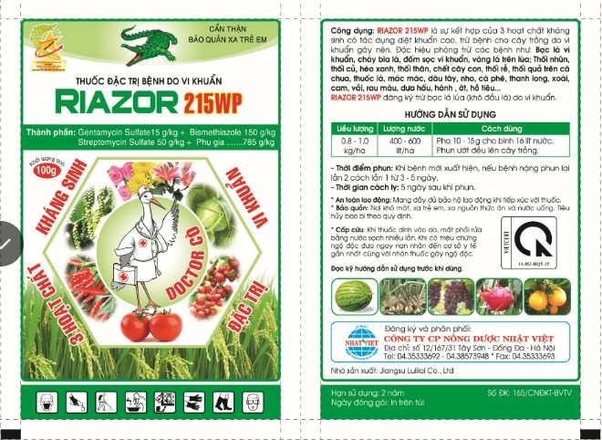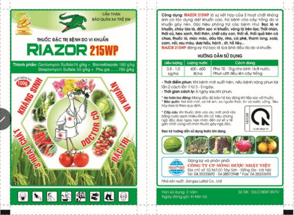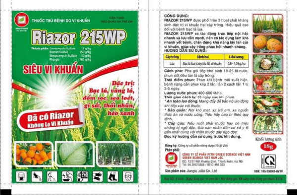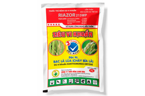 - THUỐC TRỪ BỆNH RIAZOR 215WP là một sản phẩm tiên tiến và hiệu quả, được tạo thành từ sự kết hợp của ba hoạt chất chính: Bismethiazol 150g/kg, Streptomycin sulfate 50g/kg và Gentamycin sulfate 15g/kg.