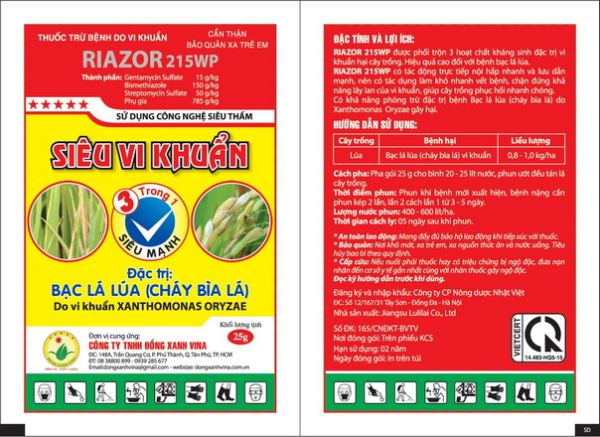 - Sự kết hợp linh hoạt của Bismethiazol, Streptomycin sulfate và Gentamycin sulfate trong RIAZOR 215WP không chỉ cung cấp sự bảo vệ mạnh mẽ mà còn giúp cải thiện sức khỏe của cây trồng, tăng cường khả năng chống chịu và đảm bảo một mùa vụ mạnh mẽ và bền vững.